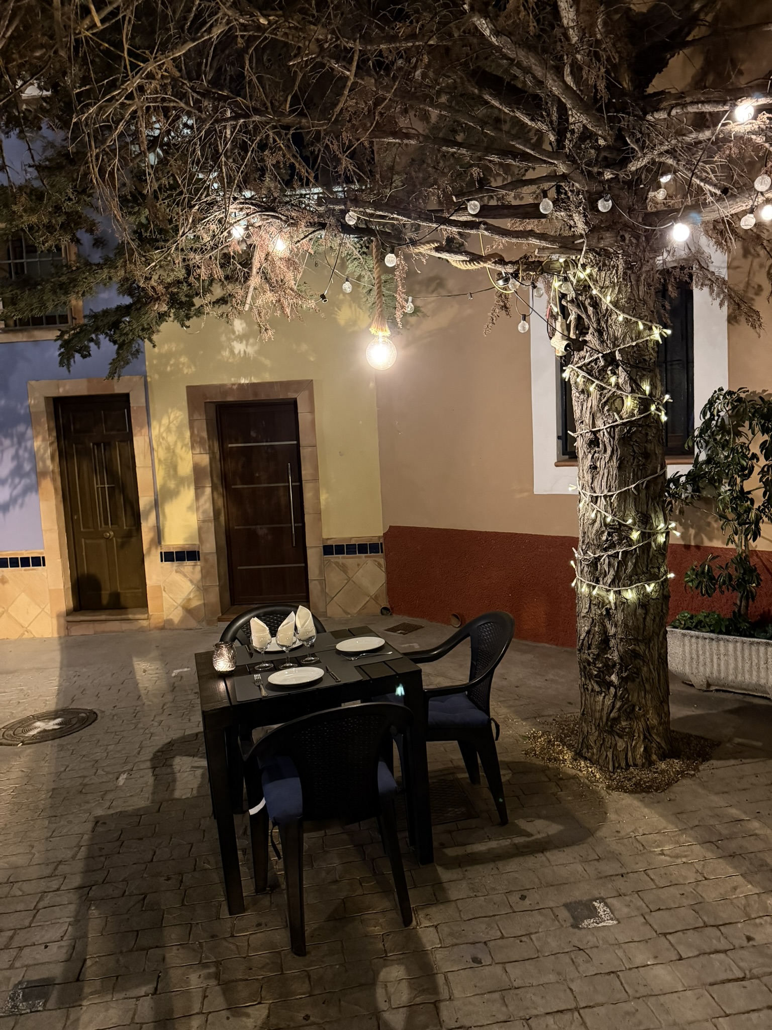 Und in dieser kleinen Gemeinde neben Radebeul quasi das genaue Gegenteil zu Meißen. Ein kleiner, nahezu unscheinbarer Wohnort mit einem interessanten Zentrum. Die Mitte des Ortes bildet eine kleine zweiteilige Straße, von einem baumbestandenen Fußweg geteilt. Beide Straßenseiten werden von zweistöckigen Wohnhäusern mit Giebelausrichtung zur Straße gesäumt: und beherbergen mehrheitlich Kneipen bzw. Gaststättenn oder kleine >‘Kolonialwarenläden‚. (Kolonialwaren? Was war das nochmal? Deutschland hatte mal Kolonien. Und aus diesen Kololonien wie Deutsch-West-Afrika kamen diese, siehe >Wikipedia) Und, das Entscheidende, sind sauberst restauriert und individuell ‚beschriftet‘. In der Winterzeit werden alle Häuser mit künstlerischen und sehr bunten Fassaden beleuchtet.