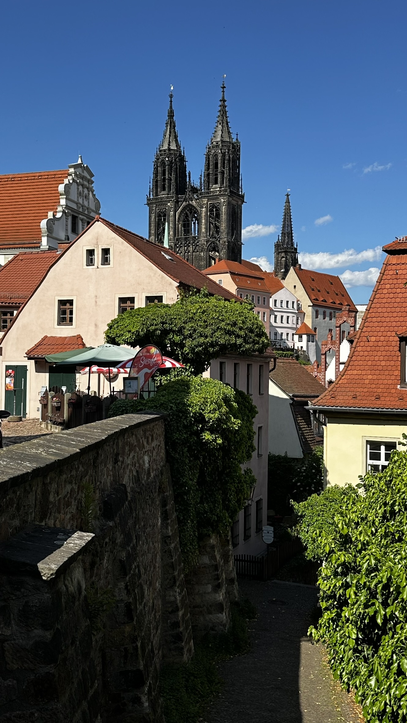 Eine unserer ersten Radtouren führte uns von Radebeul nach >Meißen. Schon der majestätisch anmutende Anblick des über der Elbe thronenden Doms und der Albrechtsburg war ein Wow-Effekt. Das Zentrum Meißens ist kopfsteinpflaster-dominiert, nahezu mittelalterlich eng – und steil. Aber erst einmal oben, lohnt sich sowohl der Ausblick über das Elbtal als auch das rote Dachgewirr der Unterstadt. Informationen zu >Dom und >Albrechtsburg sollte man sich in den entsprechenden Fachmedien anlesen. Denn beide sind optisch überwältigend. 1250 wurde begonnen, den Dom zu errichten. Richtig fertig wurde er jedoch erst 1909 nach Fertigstellung der Domtürme. 1470 wurde auf Basis einer mittelalterlichen Burg das erste ! deutsche Schloß errichtet. Wurde jedoch nie als solches tatsächlich genutzt. Und ab 1710 bis Mitte des 19. Jhdt. diente die Albrechtsurg als Sitz der staatlichen >Porzellanmanufaktur Meißen .