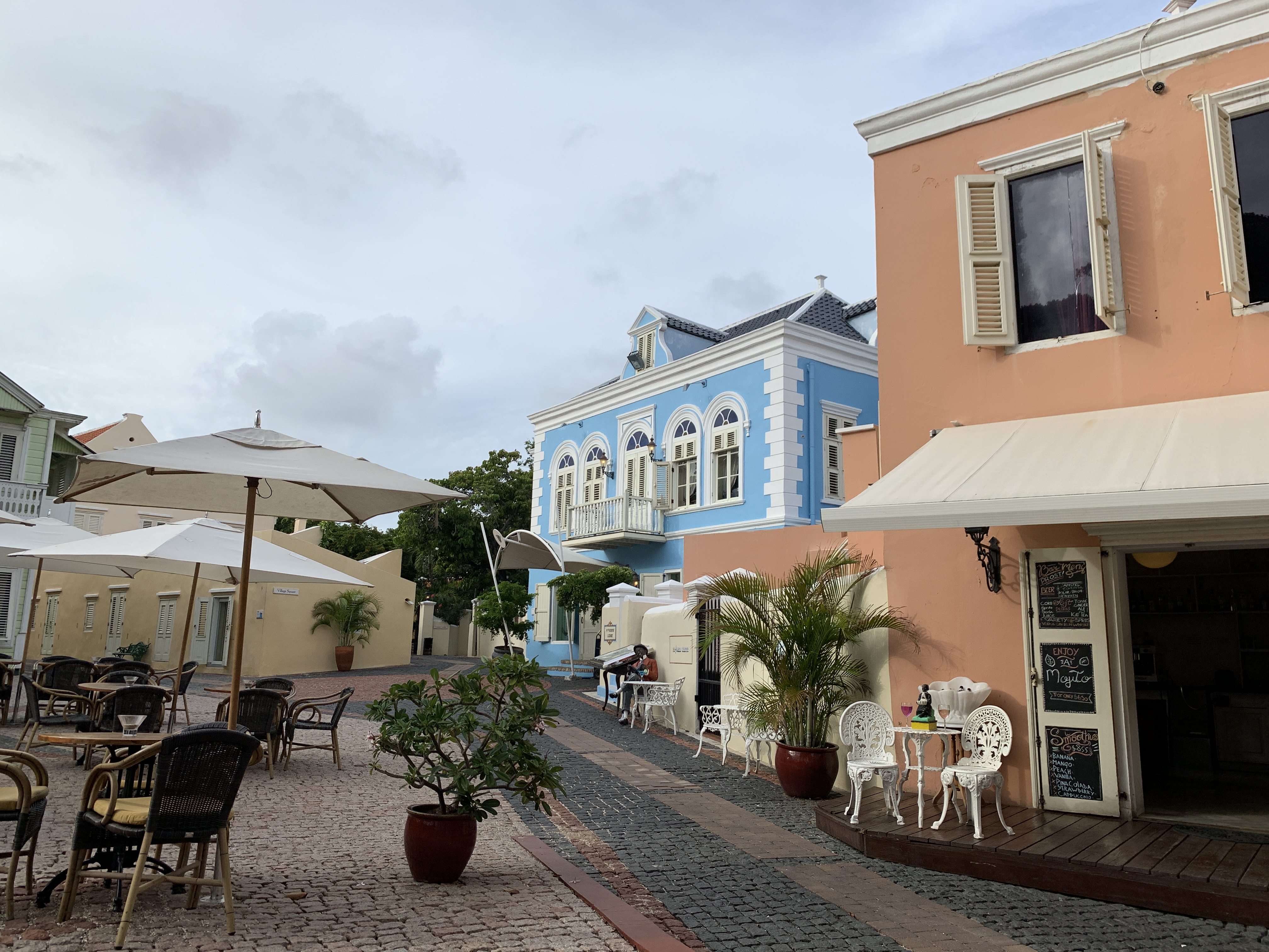 Kolonialzeit. Der gesamte Komplex ist ein Hotel. Jedes Haus in den Gäßchen ist ein Hotelzimmer bzw. Wellness- oder Veranstaltungsraum. Der zentrale Marktplatz ist das Restaurant bzw. der Frühstücksraum. Der Komplex beherbergt zudem ein Museum zur Geschichte der niederländischen Kolonialzeit/-herrschaft. Ein Stück weiter der Mole entlang Richtung Fort bzw. Meer liegt das Kreuzfahrerterminal. Ein Rummelplatz mit Shops, Restaurants etc. für die, hauptsächlich US-amerikanischen, Kreuzfahrttouristen. Hier können zeitgleich zwei Kreuzfahrer anlegen. Dann geht hier und in dem kleinen ‚Hauptstädtchen‘ die Post ab!