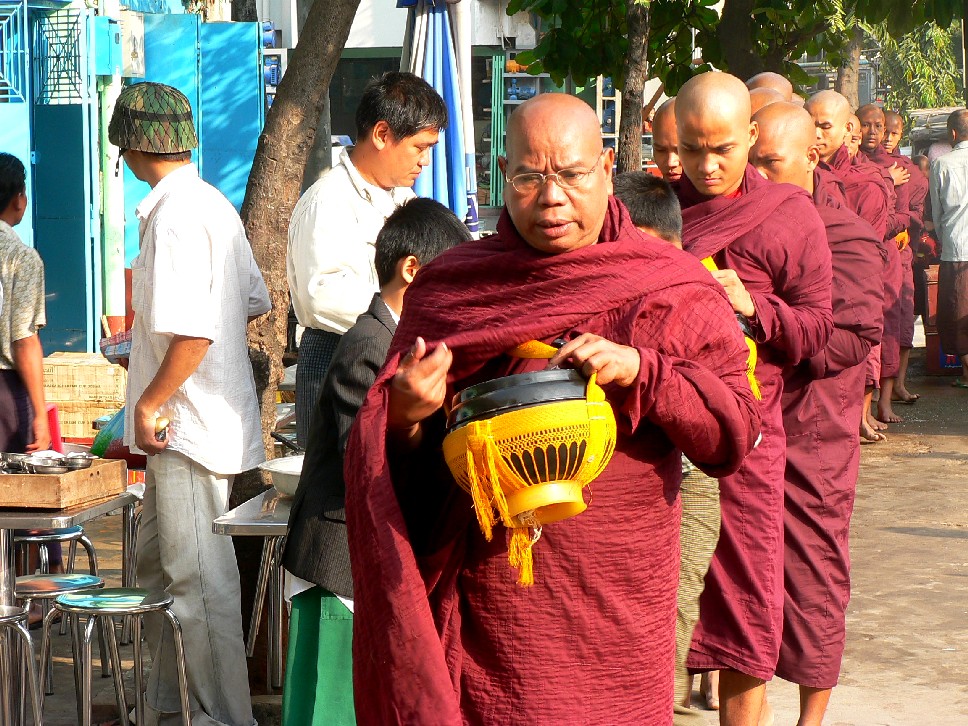 Weiterbildung, Wohlergehen der Bevölkerung. In jeder Familie, so wie in vielen anderen asiatischen Ländern, geht ein Familienmitglied, meist die Jungs, einmal im Leben in das Kloster. Das ist eine riesen Highlight im Leben eines Menschen. Ins Kloster gehen kann allerdings heissen, für 3 Tage, für 3 Monate, ein Jahr oder ein ganzes Leben. Sie sorgen aber für die Bildung im Lande, Universitäten sind in aller Regel von Klöstern geführte Schulen. Und pflegen internationale Beziehungen. Jeder kann das Kloster jederzeit verlassen. Morgens gehen die Mönche auf Opfer = Essensammlung. Bewaffnet mit einem Reistopf in einem Strickgehänge. Der Körper ist gänzlich bedeckt, er geht barfuss. Immer. Wenn Essen eingesammelt und im