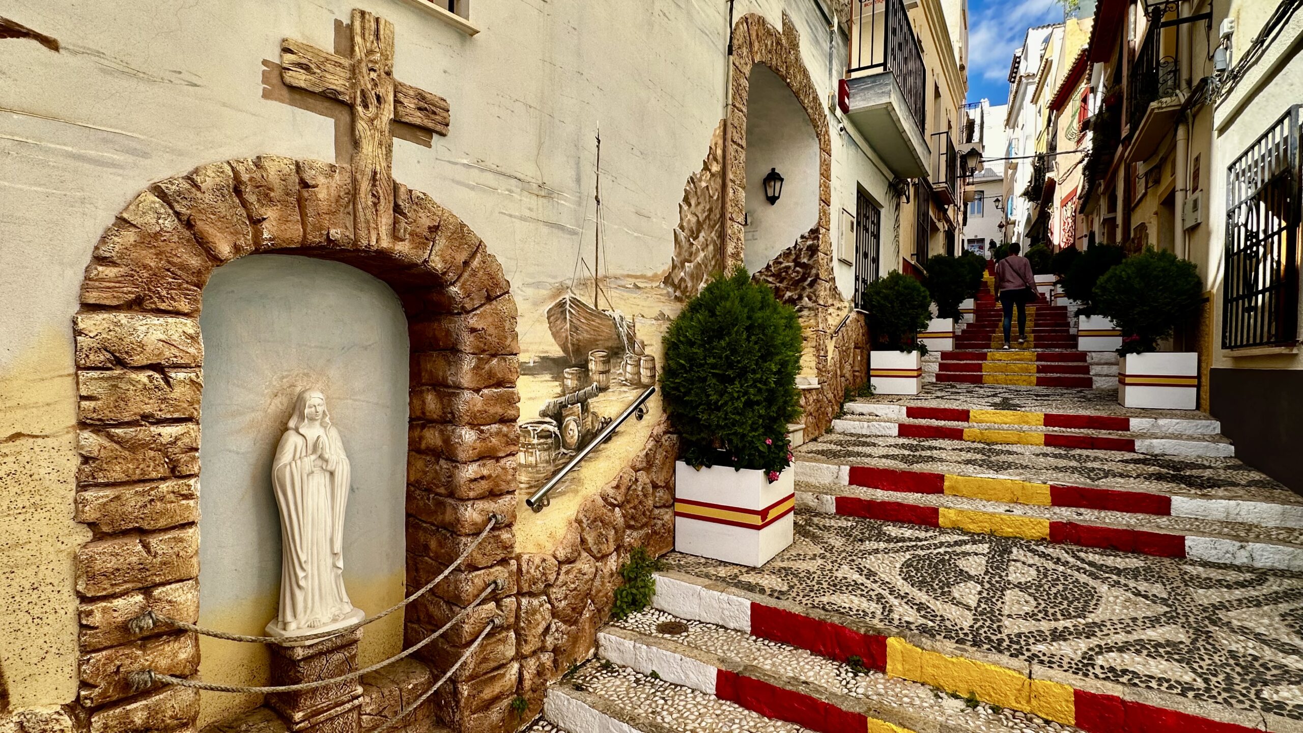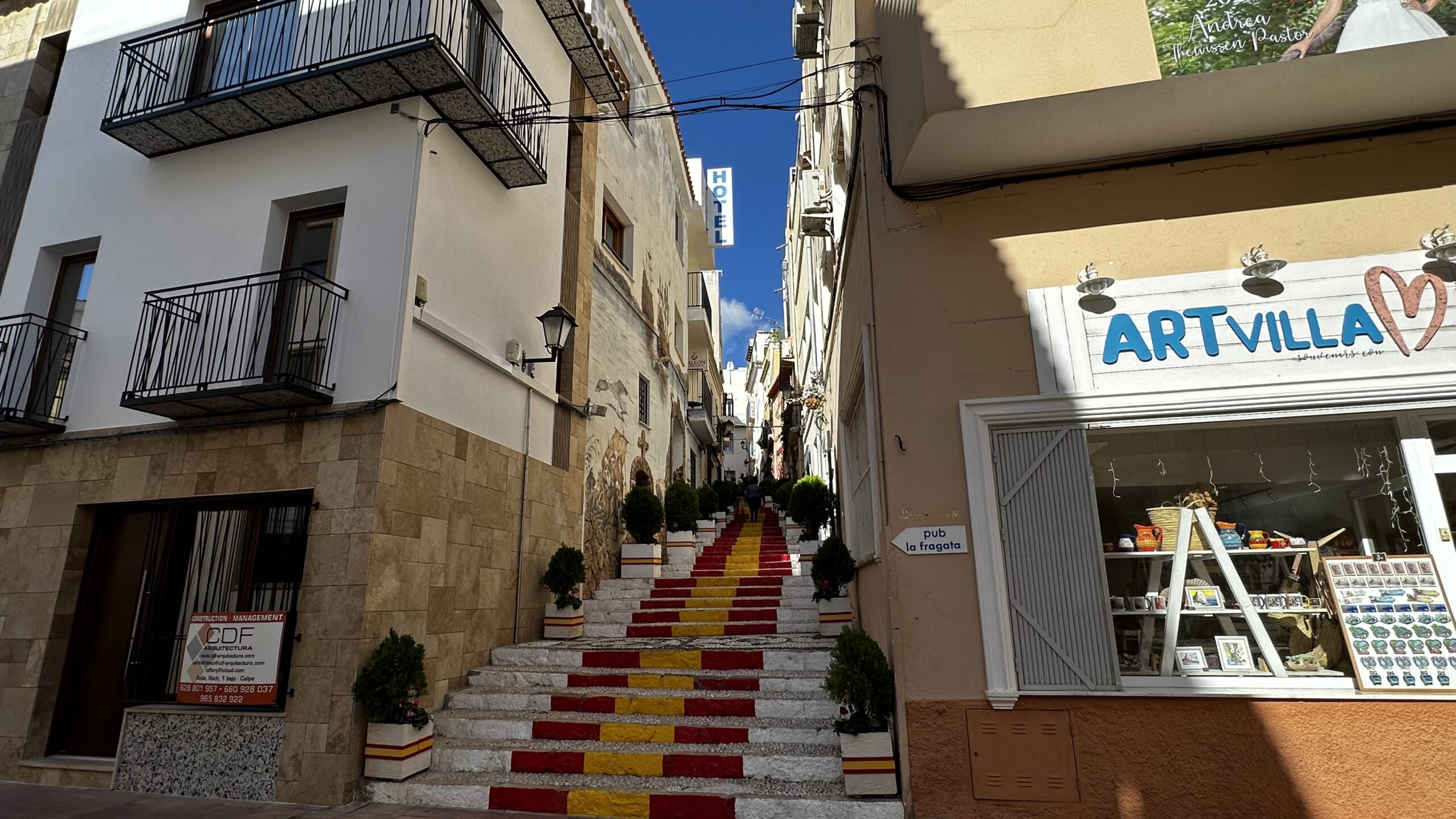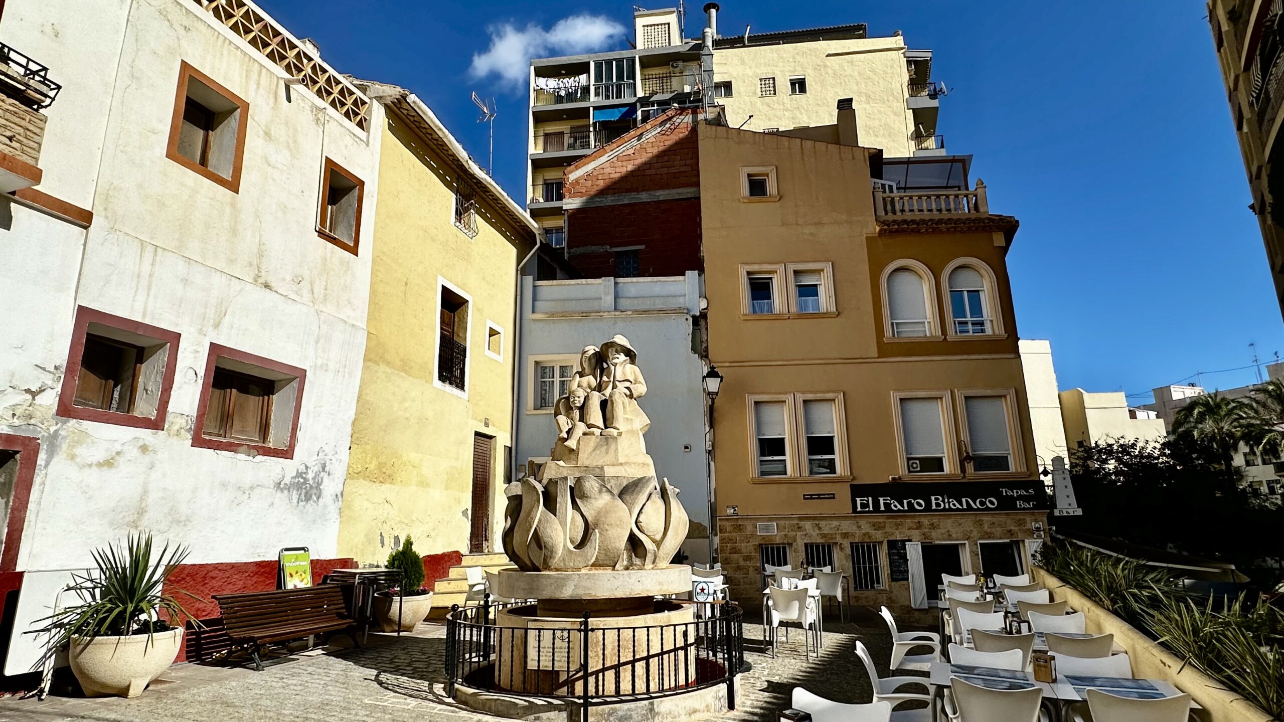 Quasi eine Bucht weiter Richtung Benidorm ein kleiner Ferienort. An der Küstenlinie eher ein kleines Städtchen mit allen erdenklichen Einkaufsmöglichkeiten wie Boutiquen, Galerien etc. In der ‚Oberstadt‘ ein eher andalusisch anmutendes Bergdorf. Rund um die Kathedrale >Església La Mare de Déu del Consol. Mittlerweile ein Touristenmagnet. Vor 20 Jahren noch besinnlich ruhig😳. Trotz den Nachsaison Mitte November waren die Tische der Kneipen auf dem Marktplatz voll besetzt. Entlang der steil aufsteigenden Gassen zur Kathedrale reihen sich an der Nordseite Boutique, Kunsthändler, Handwerkskunst… und Restaurants. sehr viele italienisch angehaucht. An der Westseite haben sich eher Boutiquen angesiedelt. Auf jeden Fall hat man einen herrliche Ausblick über das Meer. Bis rüber zum Ifach bei Calpe – aber auch zu den ‚Wolkenkratzern‘ an der Playa von Benidorm.