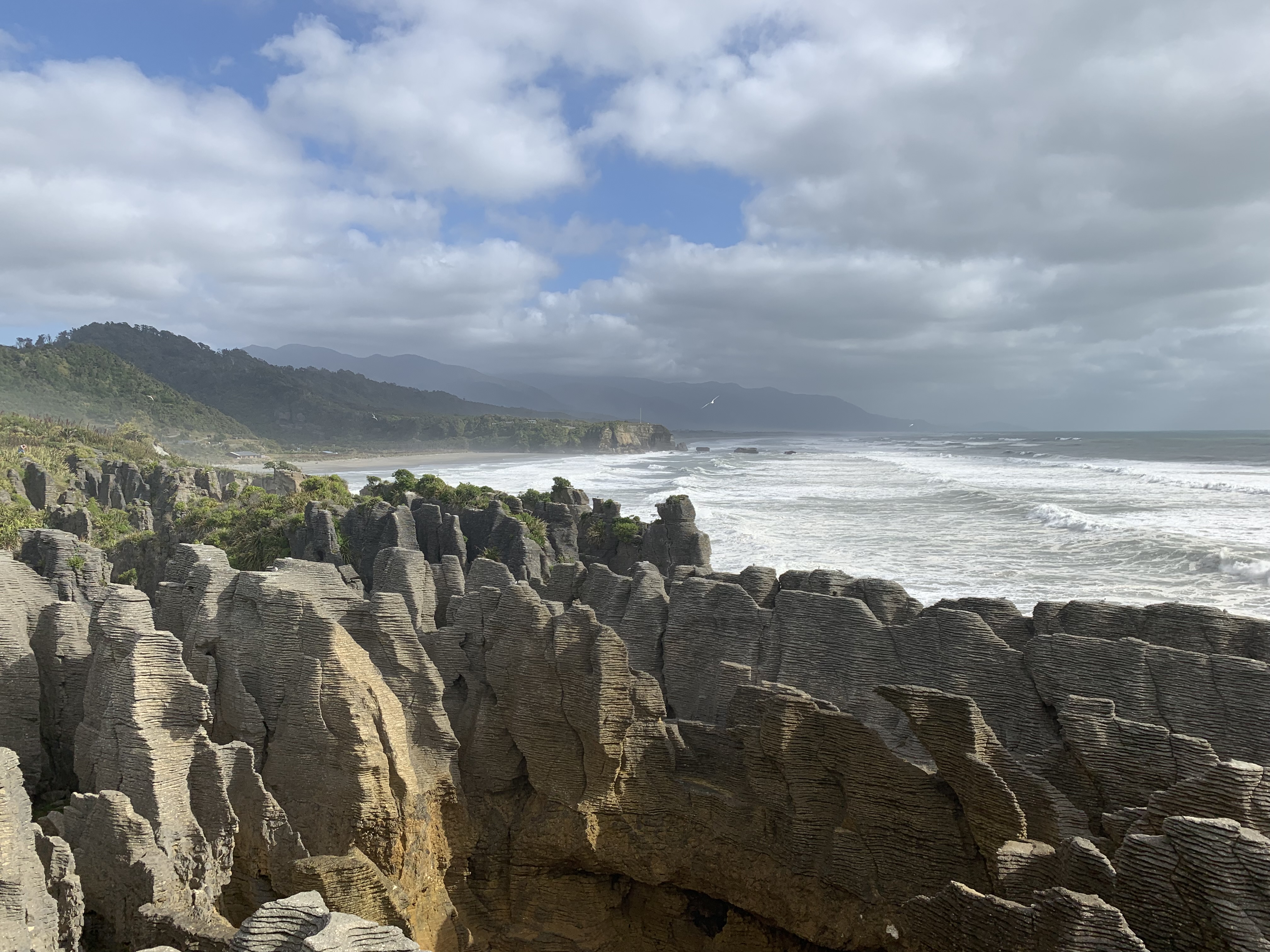 Und immer weiter nach Süden: Wir entfernten uns zwar ‚zusehends‘ vom Äquator. Aber die Landschaft wurde atemberaubender, südseehafter, exotischer, ja wilder. Durch bzw. zwischen ->Kahurangi NP und dem ->Nelson Lakes NP hindurch ging es an die Westküste zum ->Paparoa NP, zu den -> Pancake Rocks. Eine Felsformation mit echtem Südsee-Flair, geschichtet wie Pfannkuchen, umbrandet von den Wogen des Süd-Pazifik an schroffen Palmen-hängen. Bounty-Like   -> Punakaiki Beach.