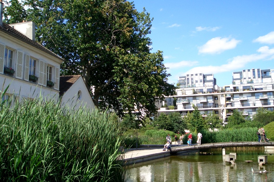 Ein Park, gegenüber der Bibliothek Mitterand, auf dem Gelände der ehemaligen Pariser Weinlager, -Hallen und -Felder. Heute eine Mischung aus Erholungspark, Qualitäts-Wohn-Gebiet, Shopping-Area und Congress-Hallen. Alles in allem aber sehr gelungen und ein Highlight für einen Paris-Bummel. Und nun in 2008 wieder neue Eindrücke aus unserer Traumstadt: einer der schönsten Parks der Stadt – der Parc des Buttes Chaumont.      Eine ehemalige Gips-grube mit steilen Felsen, einem Aussichtsturm, einem See und alpinen Wiesen. Und gleich nebenan das Qaurtie d’Amerique, in dem die damaligen „Bergarbeiter“ gewohnt hatten. Reihenhäuser mit Vorgärtchen, wie in altbekannten deutschen Kleinstädten. Mitten in der Weltstadt.