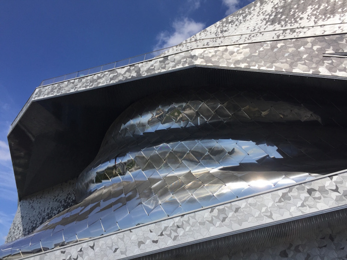 Angeblich schmücken 84.000 Vogel-silhuetten den Vorplatz und das ganze Gebäude. Die Silhuetten sind in weiss, grau und antrazit gehalten und wirken durch ihre Anordung wie sich auf silbernem Material spiegelnde Wolken. Auch wenn garkeine am Himmel sind 🙂 Die Bilder im Anhang/unten vermitteln eine Ahnung. Der Eindruck ist phantastisch. Die Akustik soll ebenfalls phantastisch sein. Das konnten wir leider noch nicht testen. >Philharmonie de Paris