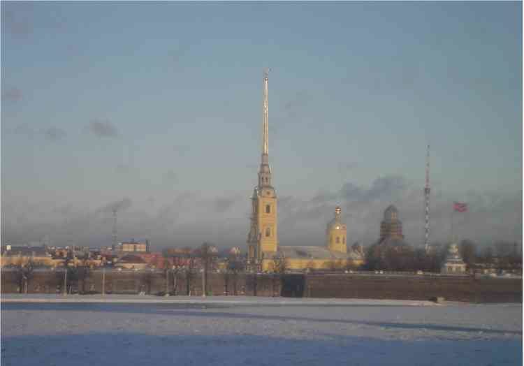 Ein Blick über die >Newa, im Winter dick zugefroren, trifft auf die >Peter-Paul-Festung mit dem „Goldenen Finger“, weithin sichtbarer goldener Kirchturm der >Peter-Paul-Kathedrale. Direkt daneben liegt der >Kreuzer Aurora. Historischer Startpunkt der >Oktober-Revolution: 7.11.1917 fiel der Startschuss für den Sturm auf den Winterpalast. (Zumindest im groben und verklärten Rückblick).