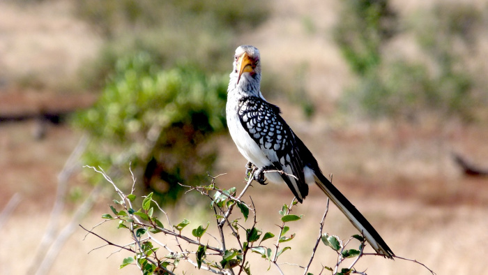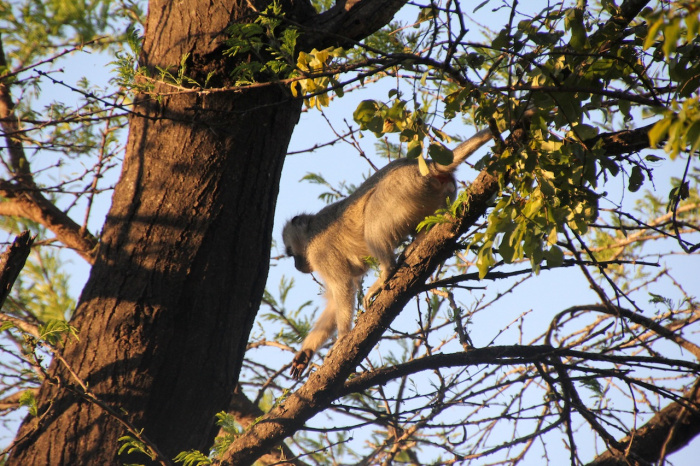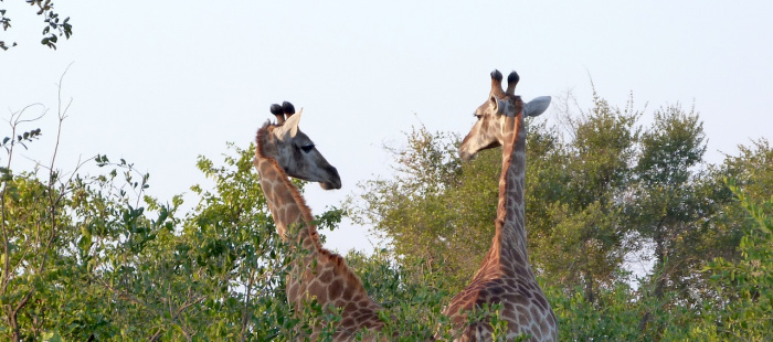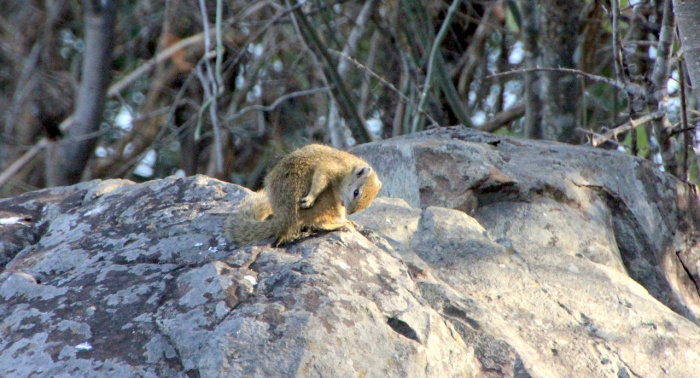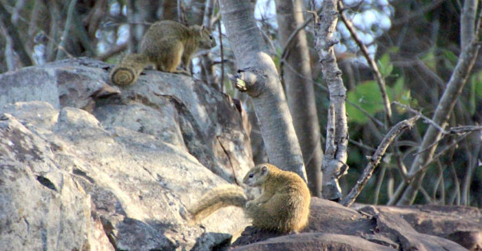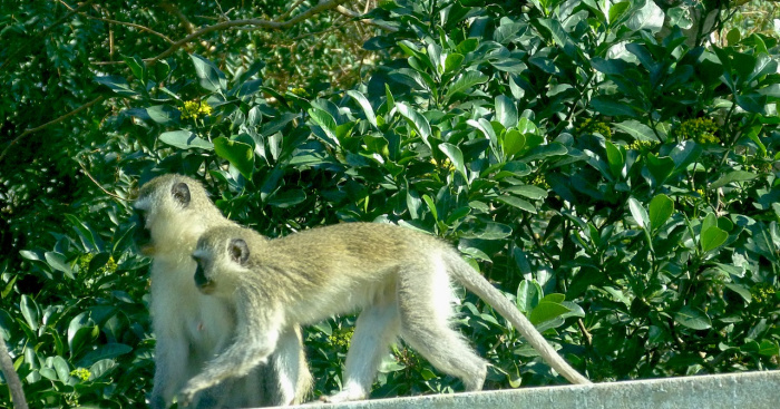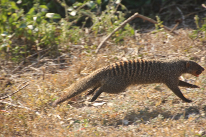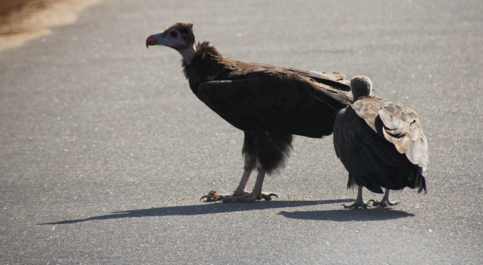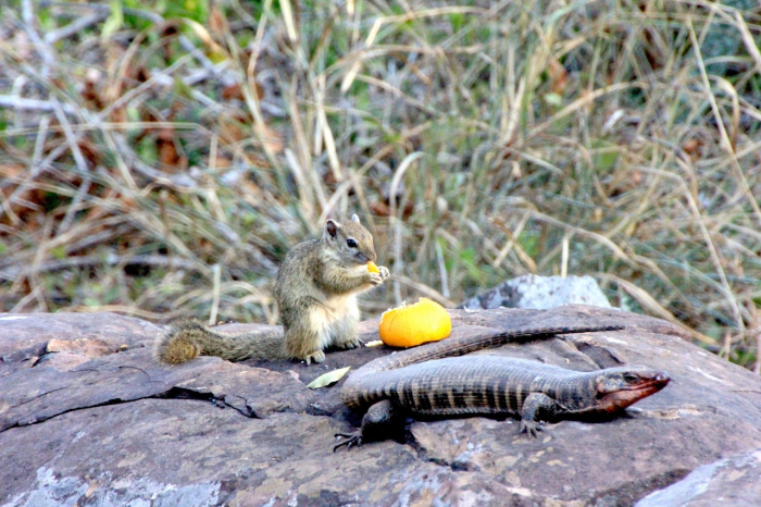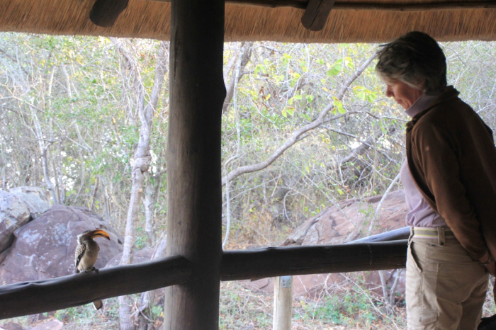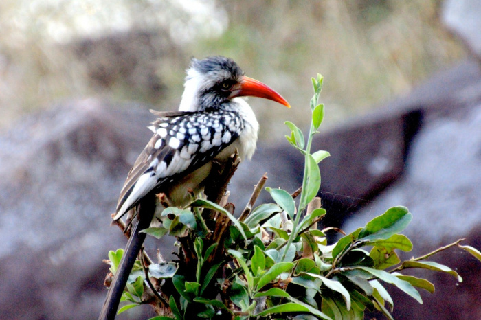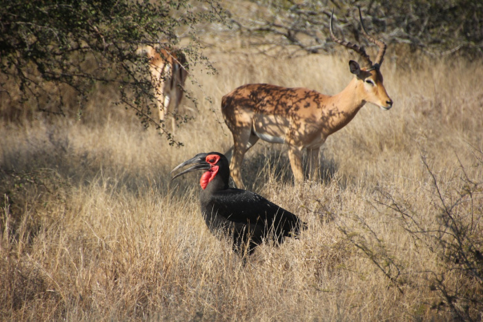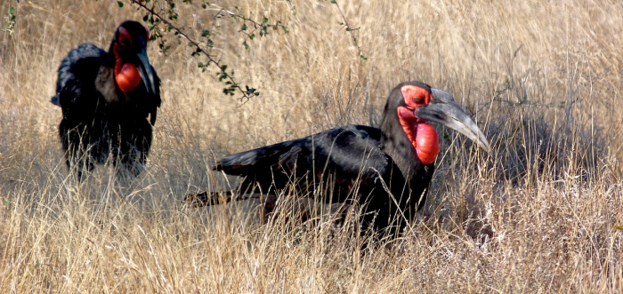 (Steinböckchen) -> Kudus -> Giraffen -> Krokodile -> Baboons -> grüne Meerkatzen -> Zebra-Mangusten -> Dassis (Klippschliefer) -> Schildkröten -> Lizards -> Streifenhörnchen -> Grauhörnchen -> Riesentrappe -> Weissrückengeier -> Strausse -> (Kronen)Adler -> Hornraben/Hornbills -> Ibisse -> Gunieafowls (Perlhühner) -> Marabus -> Tokos und Vögel aller Art. Und wer ganz viel über Afrika’s Vögel wissen will, dem sei diese Seite empfohlen: